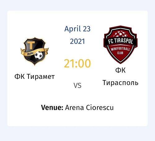 Следующую встречу МФК «Тирасполь» также проведет на Arena Ciorescu 23 апреля 2021 года с ФК «Тирамет».